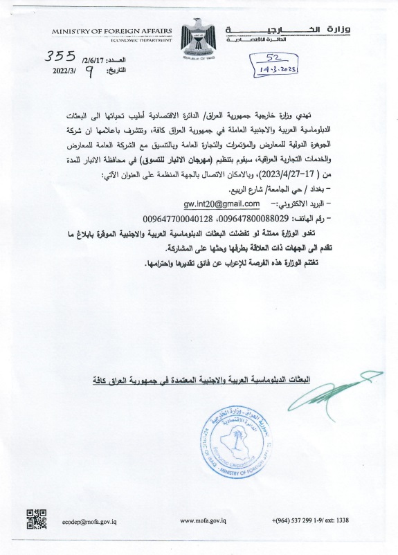 (مهرجان الأنبار للتسوق) في محافظة الأنبار للفترة من 17 إلى 27 نيسان 2023.