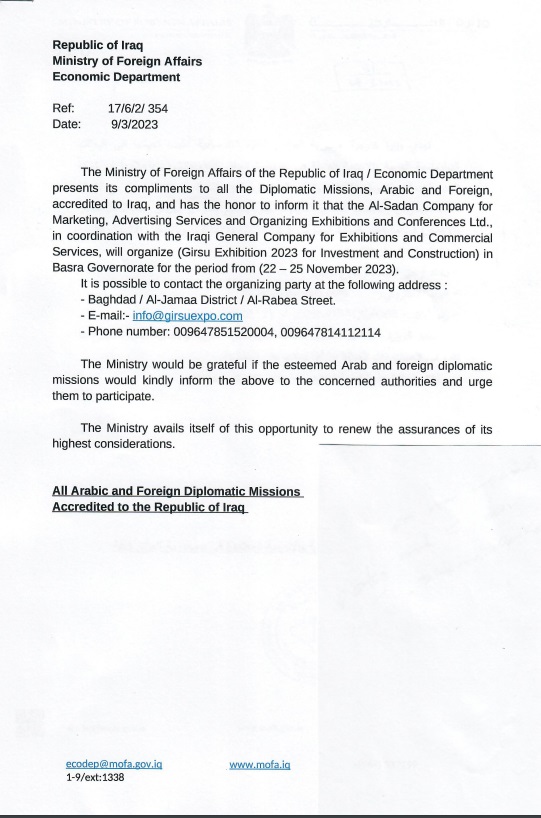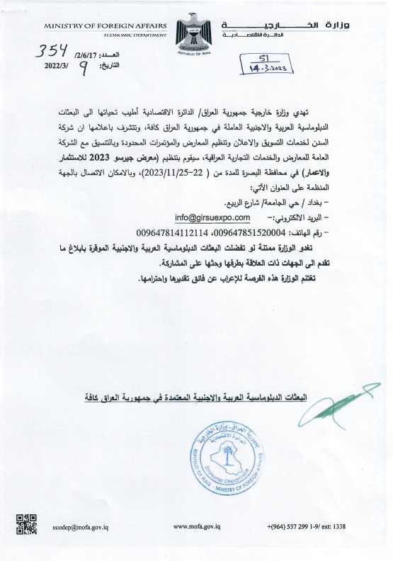 (معرض جيرسو 2023 للاستثمار و البناء) في محافظة البصرة للفترة من (22 - 25 تشرين الثاني 2023).