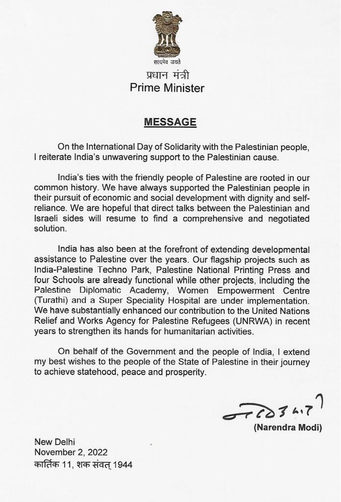 "رسالة دولة رئيس وزراء الهند السيد ناريندرا مودي بمناسبة اليوم العالمي للتضامن مع الشعب الفلسطيني."