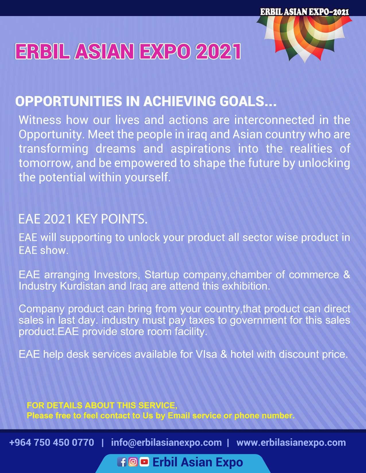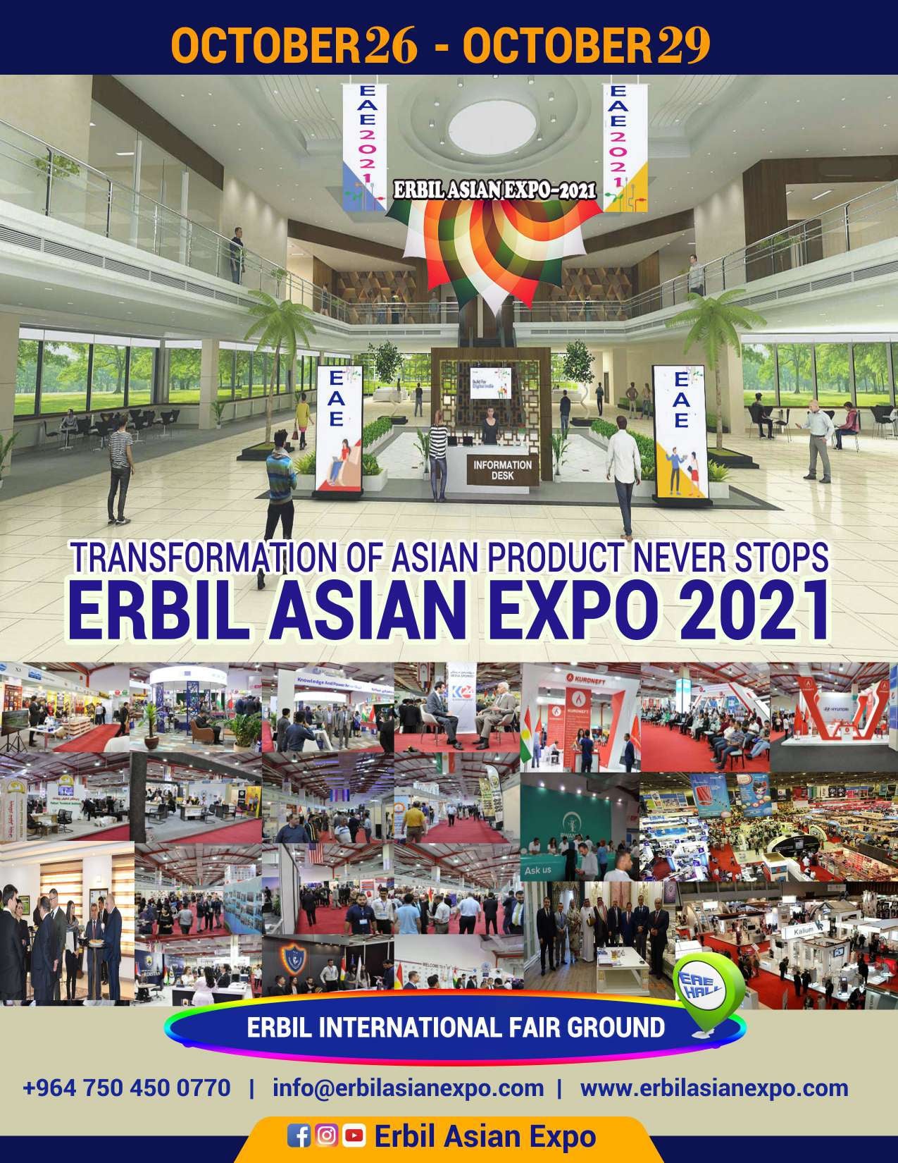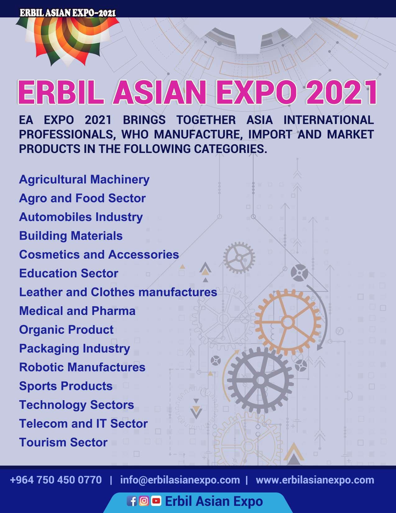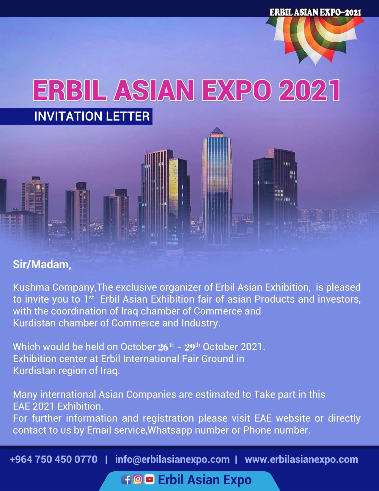1st Erbil International Exhibition of Asian Product 26-29 October 2021 (EAE 2021) fair in Kurdistan Region of Iraq is being organized by Kushma company with the coordination of Iraq Chamber of Commerce and Kurdistan Chamber of Commerce and Industry at Exhibition Center at Erbil International Fair Ground in Kurdistan. Many international Asian Companies are estimated to take part in this EAE 2021 Exhibition.