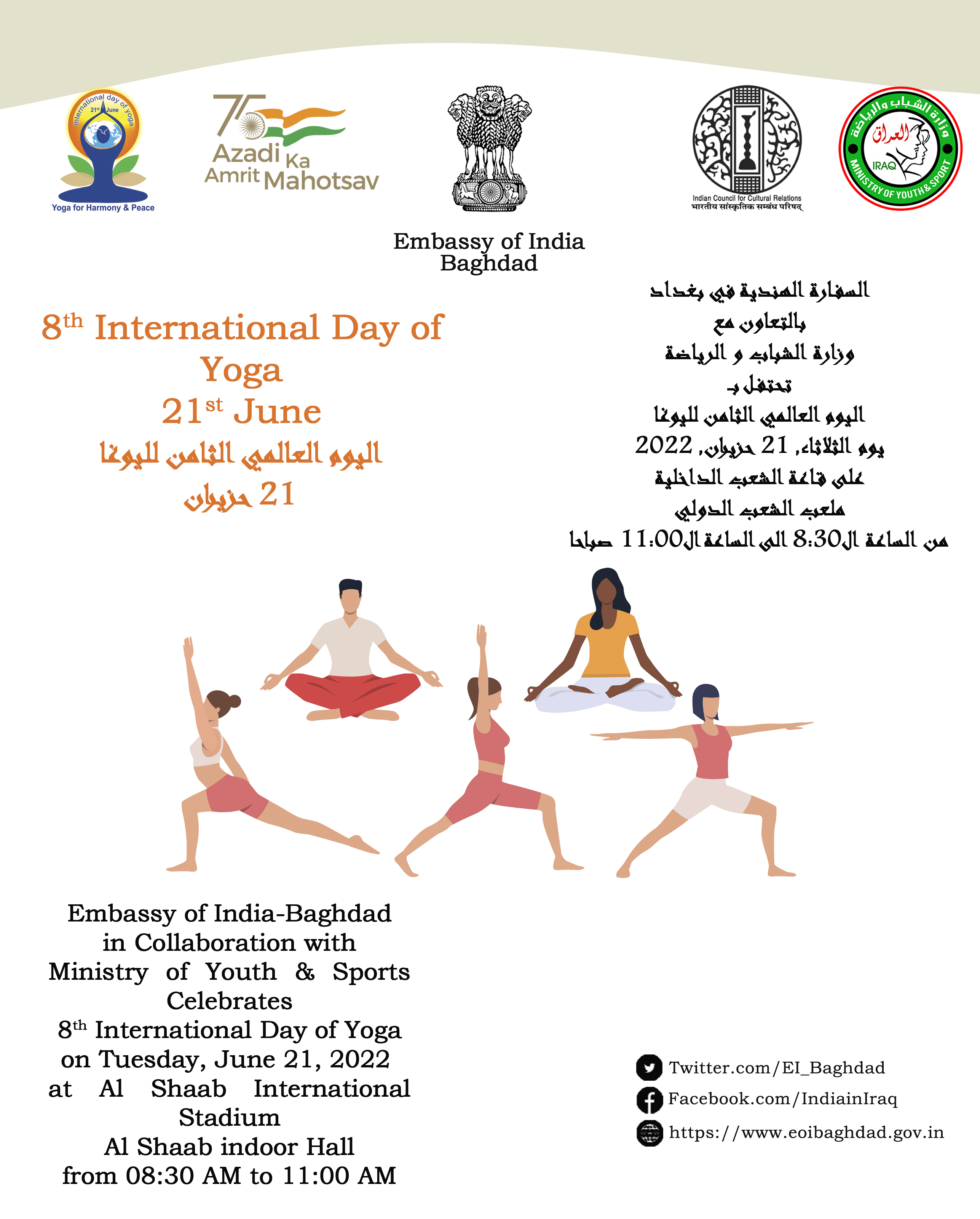8th International Day of Yoga, 2022 will be celebrated with the theme “8th International Day of Yoga, 2022 will be celebrated with the theme “Yoga for Humanity” on 21 June 2022 at Al-Shaab Indoor Stadium in Baghdad. Embassy of India, Baghdad is delighted to welcome friends of India and Yoga enthusiasts to join the event