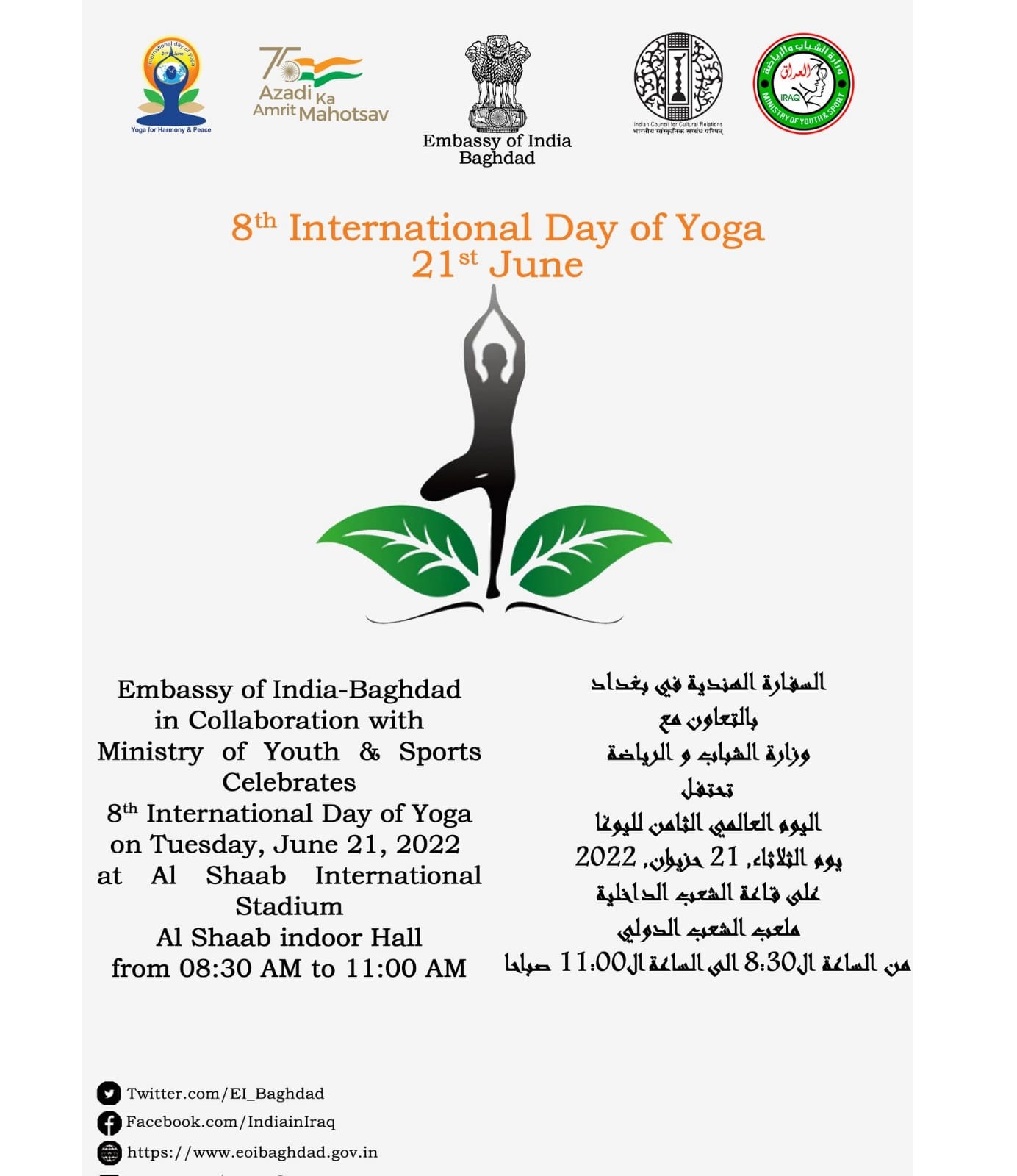 8th International Day of Yoga, 2022 will be celebrated with the theme “Yoga for Humanity” on 21 June 2022 at Al-Shaab Indoor Stadium in Baghdad. Embassy of India, Baghdad is delighted to welcome friends of India and Yoga enthusiasts to join the event