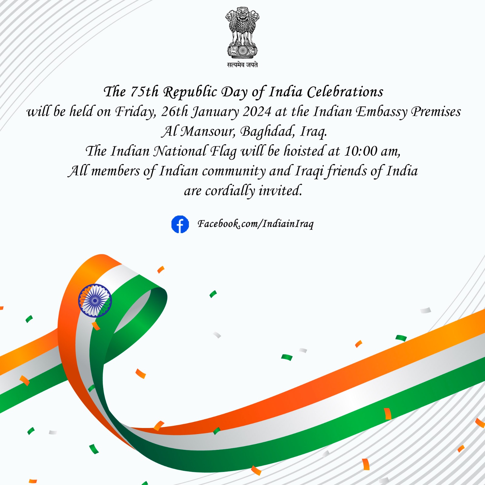 All members of Indian community and Iraqi friends of India are cordially invited on the occasion of celebration of 75th Repubic Day of India.