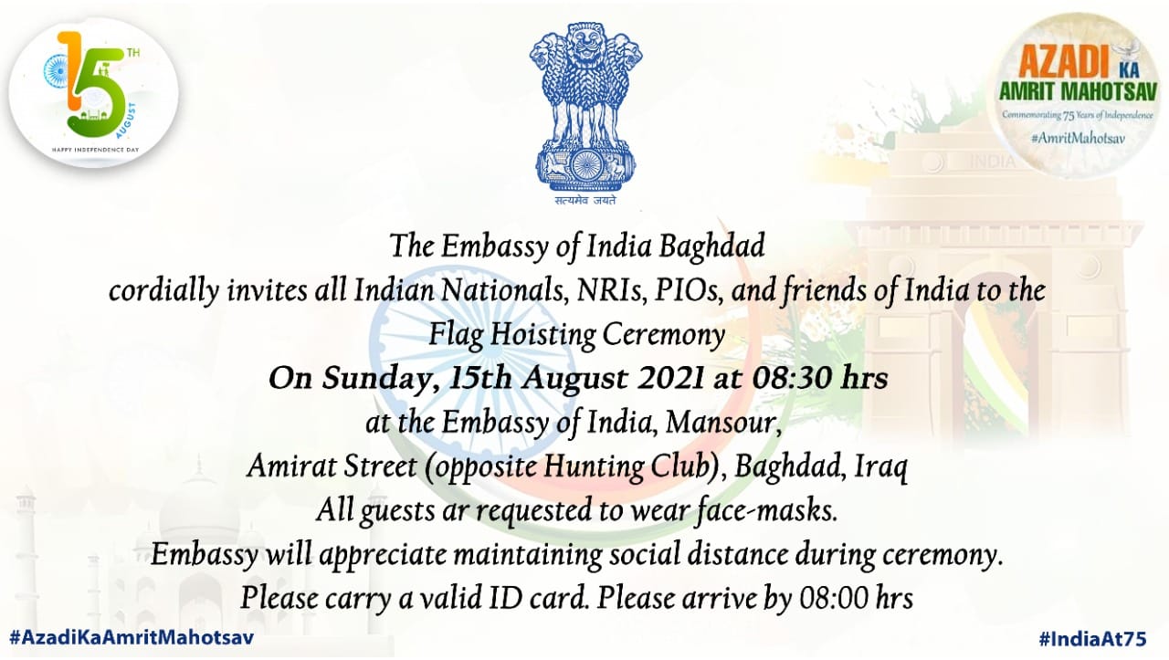 Embassy of India, Baghdad cordially invites all Indian Nationals, NRIs, PIOs, and friends of #India to join the celebration of 75th #Independence Day of India on August 15 from 8:30 AM onwards.