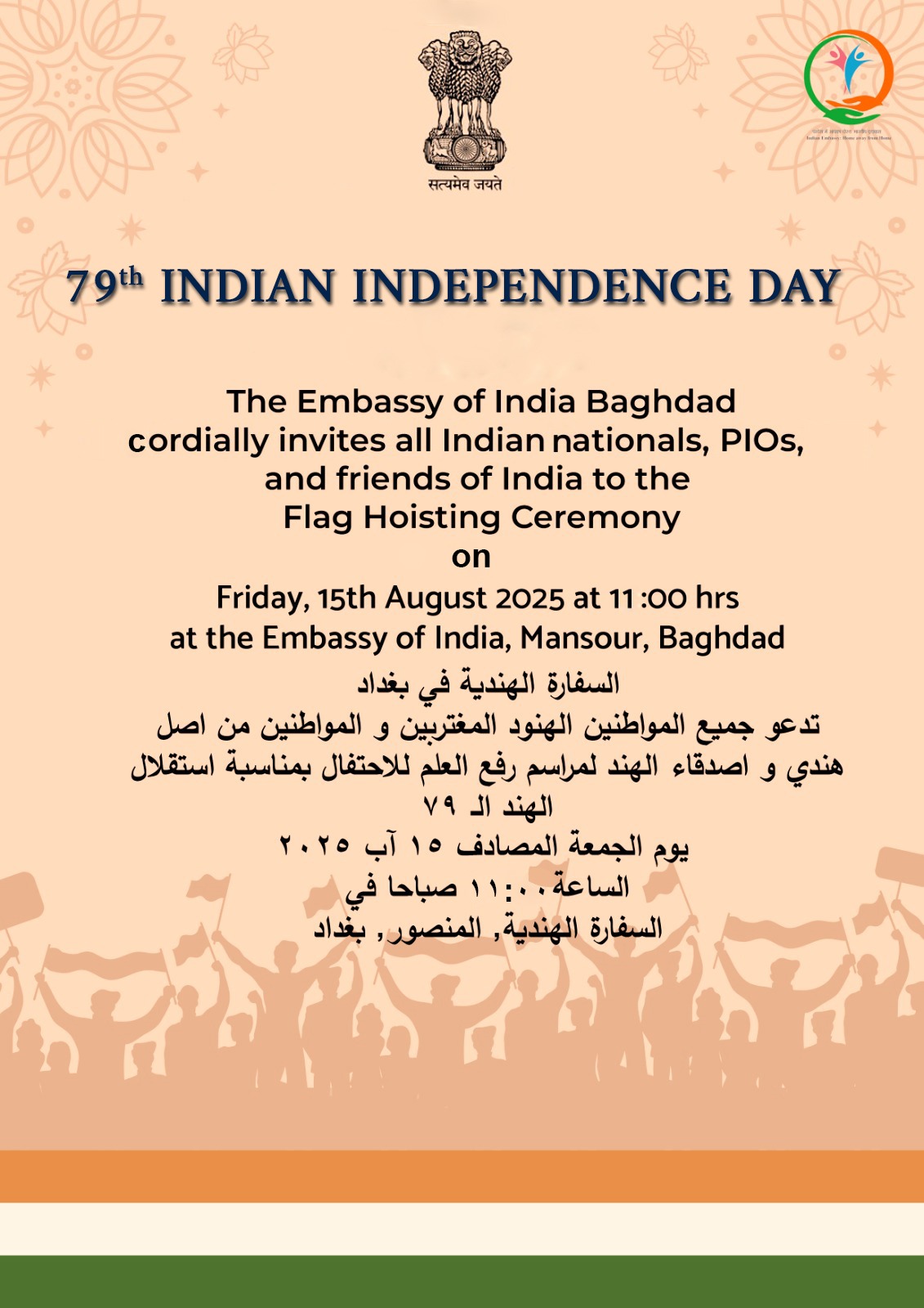 Embassy of India, Baghdad cordially invites all Indian nationals, PIOs and friends of India to the 'Flag Hoisting Ceremony' to mark the 79th Independence Day of India on 15th August, 2025 at 11:00 hrs at Embassy of India, Al-Mansour, Baghdad