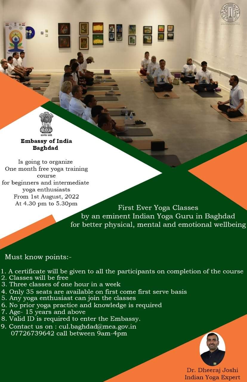 Embassy of India, Baghdad is going to organize a one-month free yoga training course for beginners and intermediate yoga enthusiasts from 1st August 2022 at 4:30 PM to 5:30 PM at the Indian Embassy building in Baghdad
