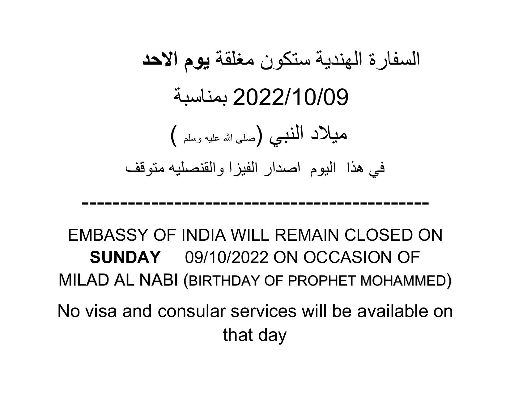 EMBASSY OF INDIA WILL REMAIN CLOSED ON SUNDAY 09/10/2022 ON OCCASION OF MILAD AL NABI (BIRTHDAY OF PROPHET MOHAMMED). No visa and consular services will be available on that day.