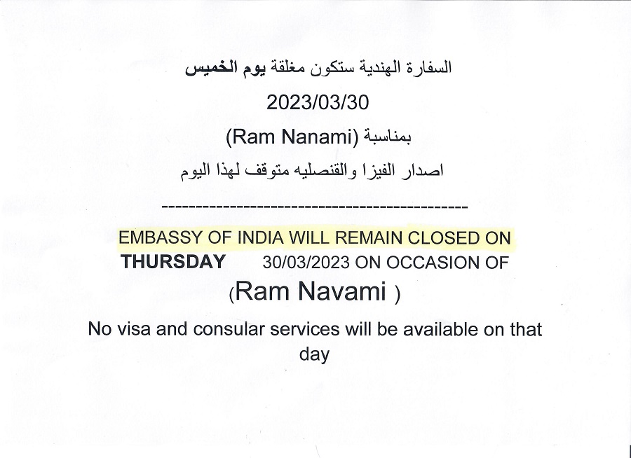 Embassy of India will remain closed on Thursday 30/03/2023 on the occasion of RAM NAVAMI