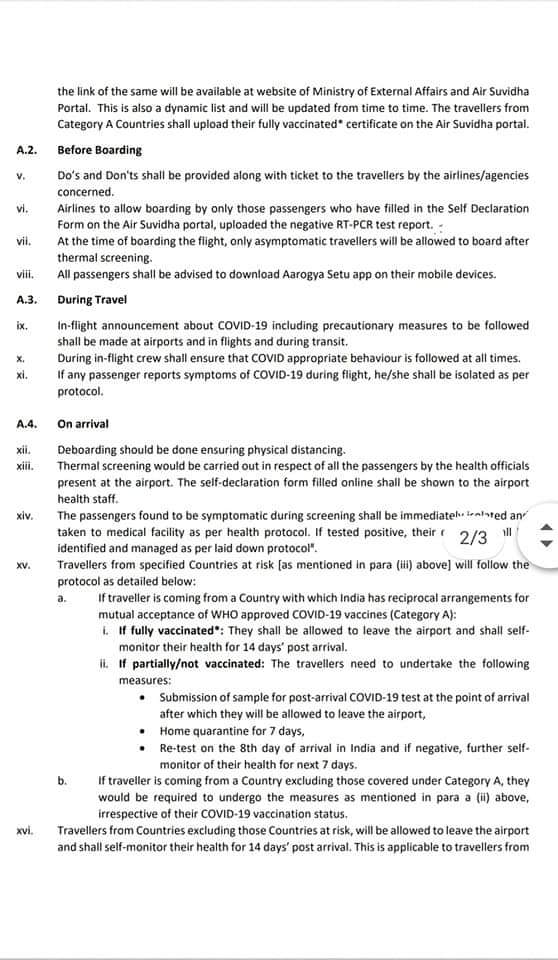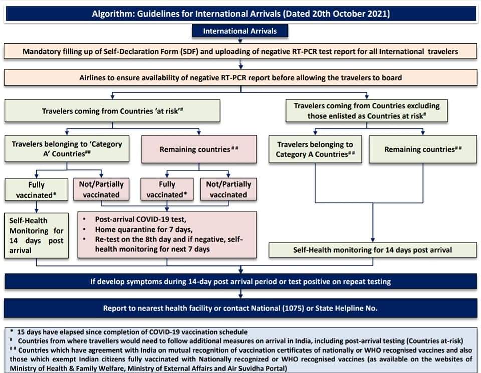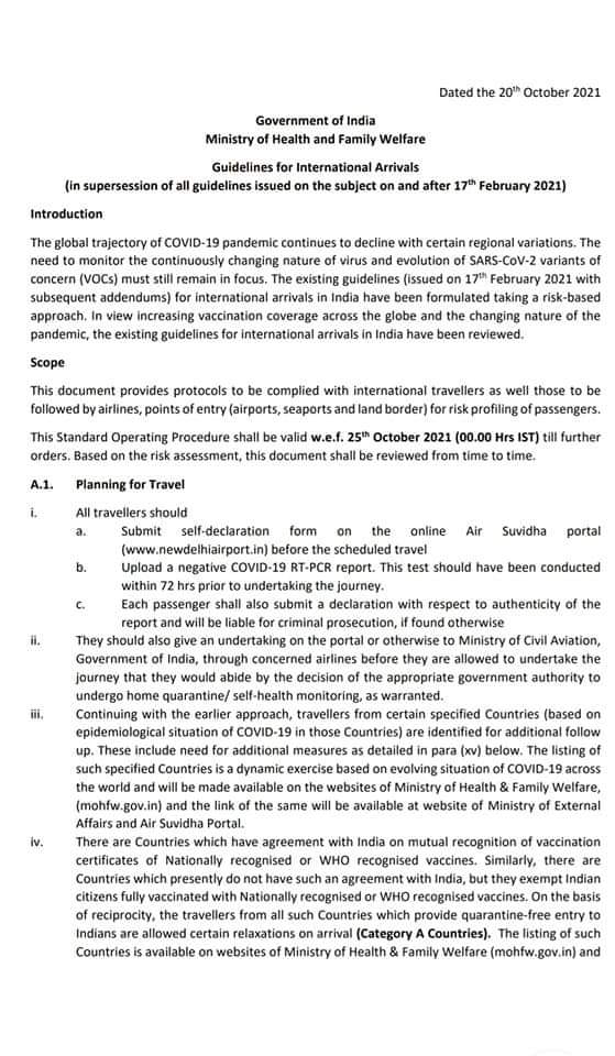 Government of India Guidelines for International Arrivals dated 20th October, 2021 (in supersession of all guidelines issued on the subject on and after 17th February 2021). This Standard Operating Procedure shall be valid w.e.f. 25th October 2021 (00.00 Hrs Indian Standard Time)