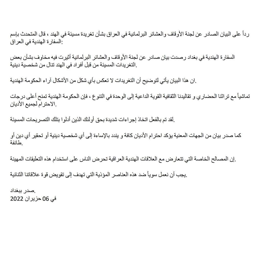 رداً على البيان الصادر عن لجنة الأوقاف والعشائر البرلمانية في العراق بشأن تغريدة مسيئة في الهند ، قال المتحدث بإسم السفارة الهندية في العراق: