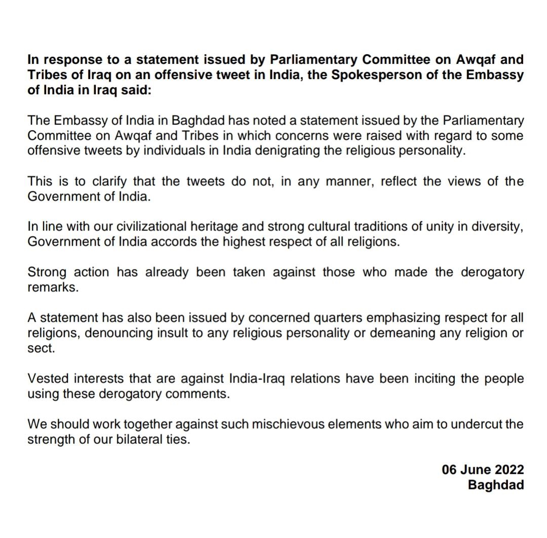 In response to a statement issued by Parliamentary Committee on Awqaf and Tribes of Iraq on an offensive tweet in India, the Spokesperson of the Embassy of India in Iraq said