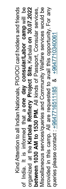 Kind Attention to all Indian Nationals, PIO/OCI card holders and friends of India. It is informed that a one day consular/Labor camp will be organized at the Karbala Refinery Project Site, Karbala on 30.07.2022 between 1030 AM to 1530 PM