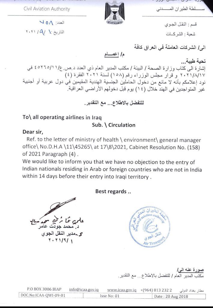 Latest decision of the Government of Iraq on travel of Indian Nationals to Iraq