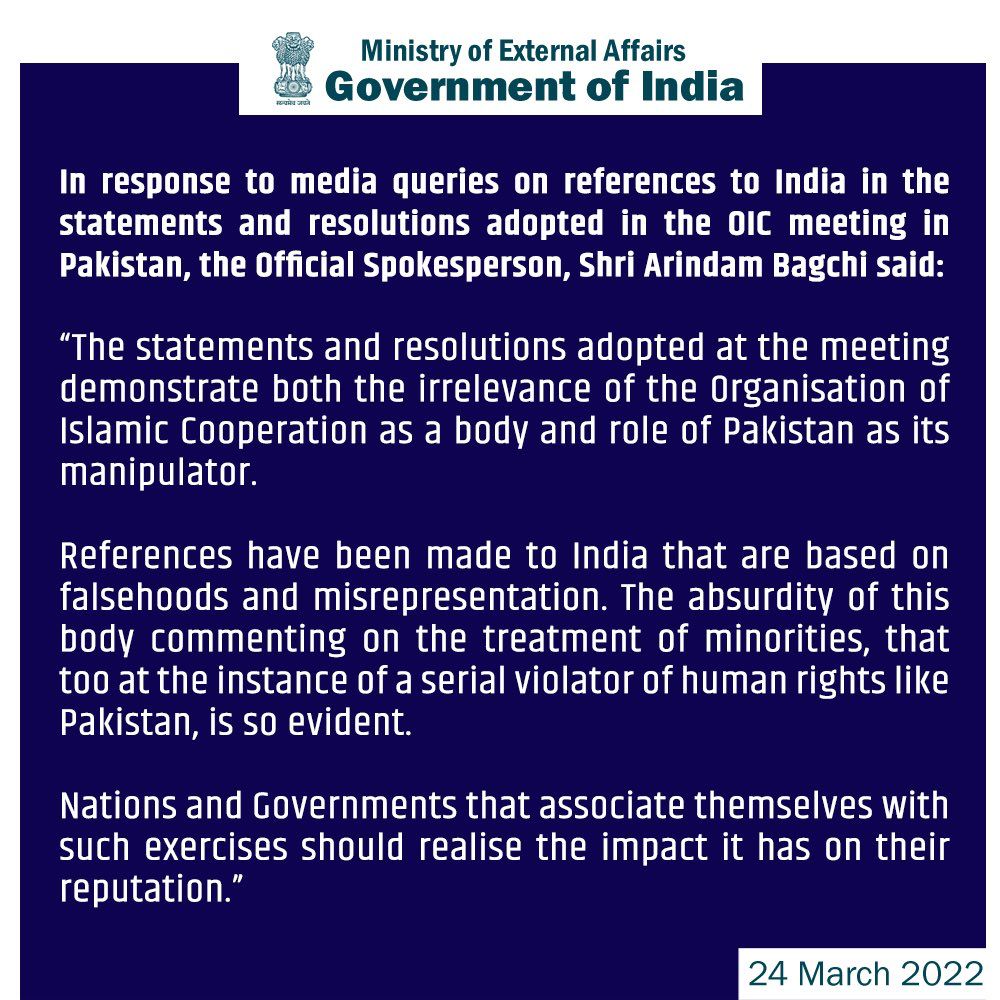 MEA's spokesperson's response to the Resolution passed at OIC's Foreign Minister's Meeting at Islamabad during March 22-23, 2022