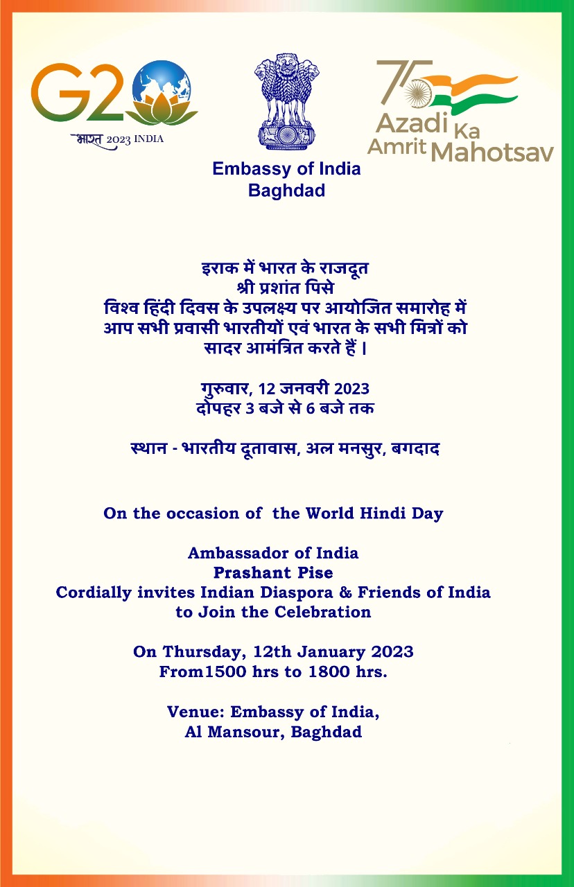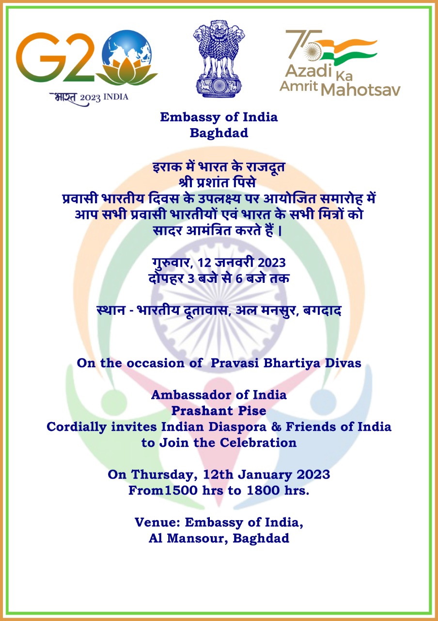 On the occasion of 'Pravasi Bhartiya Divas' and 'World Hindi Day', Embassy of India cordially invites Indian Diaspora & Friends of India to join the celebration on Thursday, 12th January, 2023 from 1500 hrs to 1800 hrs, venue at Embassy of India, Al Mansour, Baghdad.