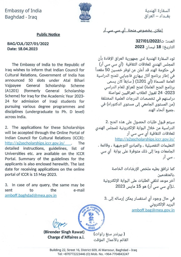 Public Notice: ICCR has announced 50 slots under Atal Bihari Vajpayee General Scholarship Scheme for Iraqi students for pursuing various degree programmes and disciplines (undergraduate to Ph. D level) across India.