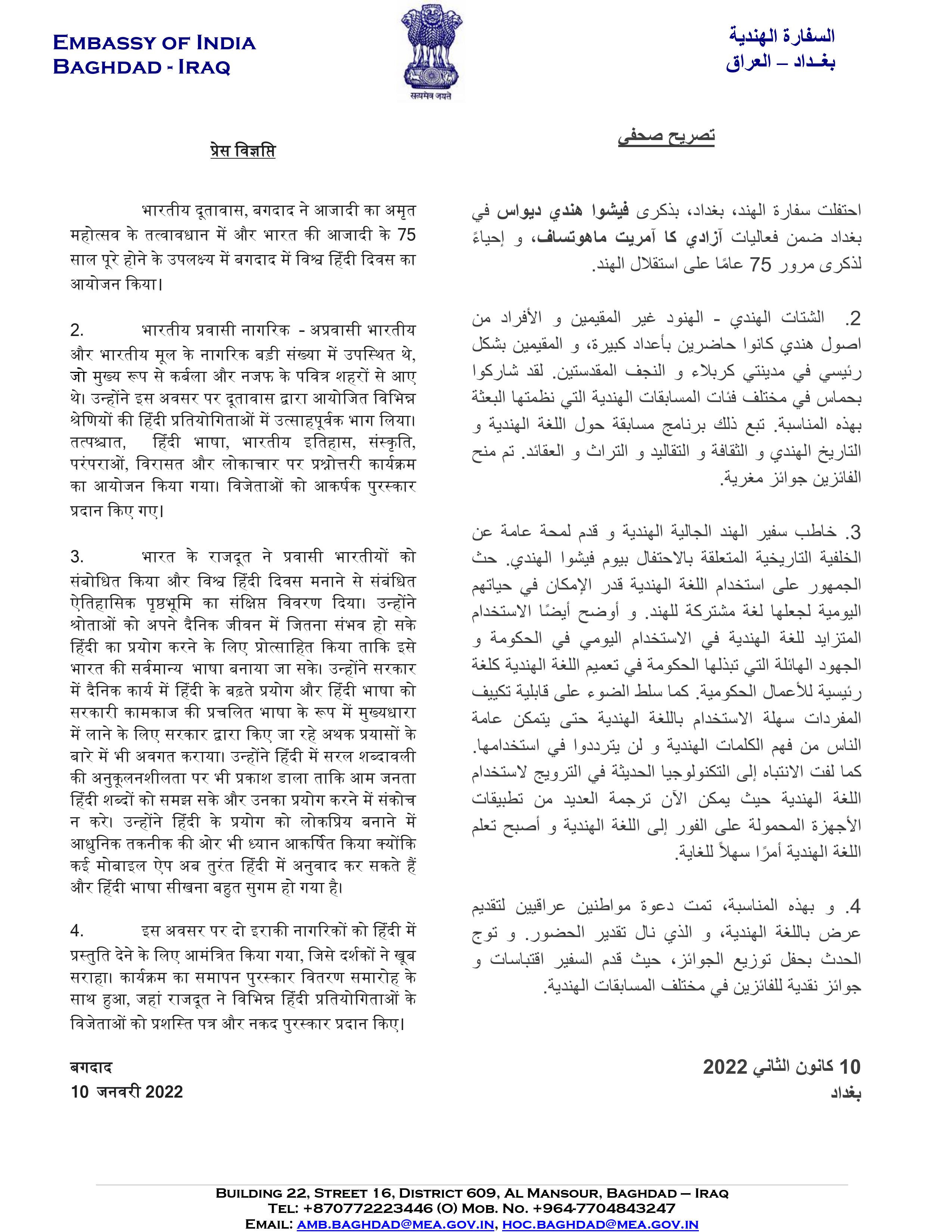 بيان صحفي بمناسبة فيشوا هندي ديواس الذي احتفلت به سفارة الهند في بغداد."