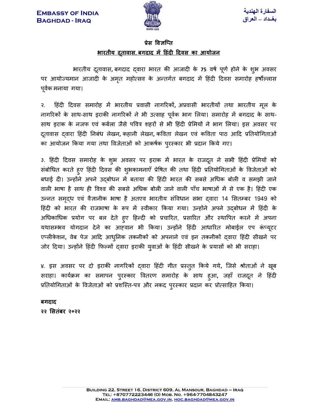 भारतीय दूतावास, बगदाद द्वारा २२ सितमबर 2022 को मनाए गए हिंदी दिवस २०२२ के लिए प्रेस विज्ञप्ति।