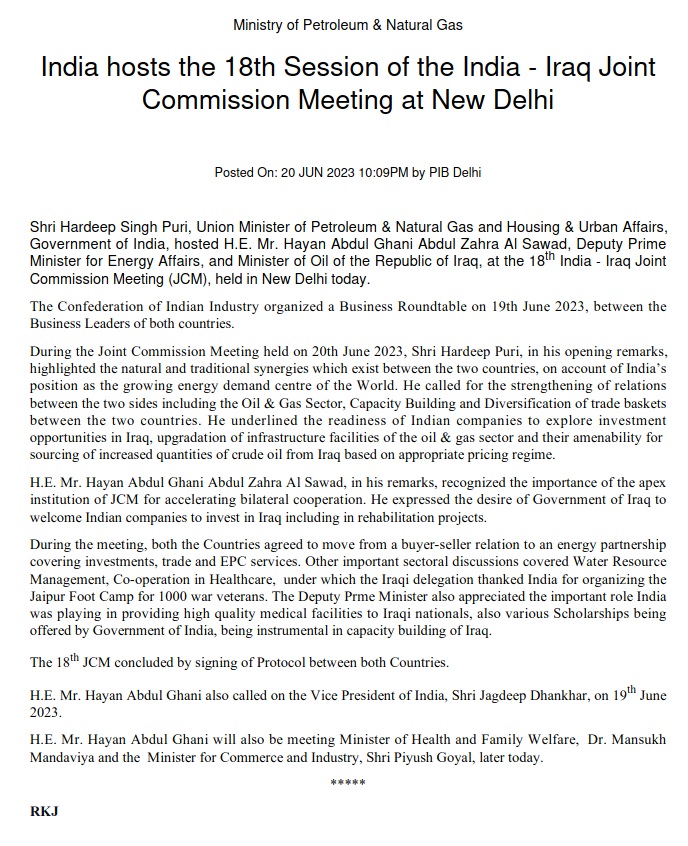India hosts the 18th session of the India-Iraq Joint Commission Meeting at New Delhi.