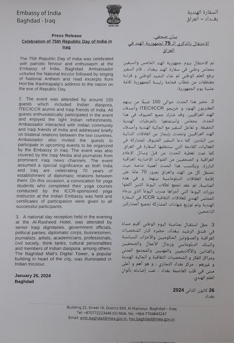 Press Release: Celebration of 75th Republic Day of India in Iraq.