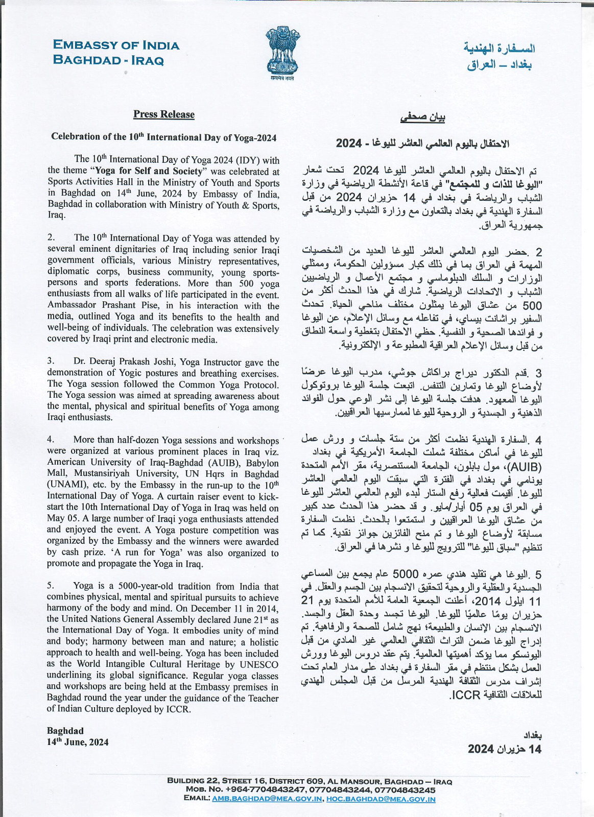 Press release: Celebration of the 10th International Day of Yoga 2024 organised by Embassy of India, Baghdad on 14th June 2024.