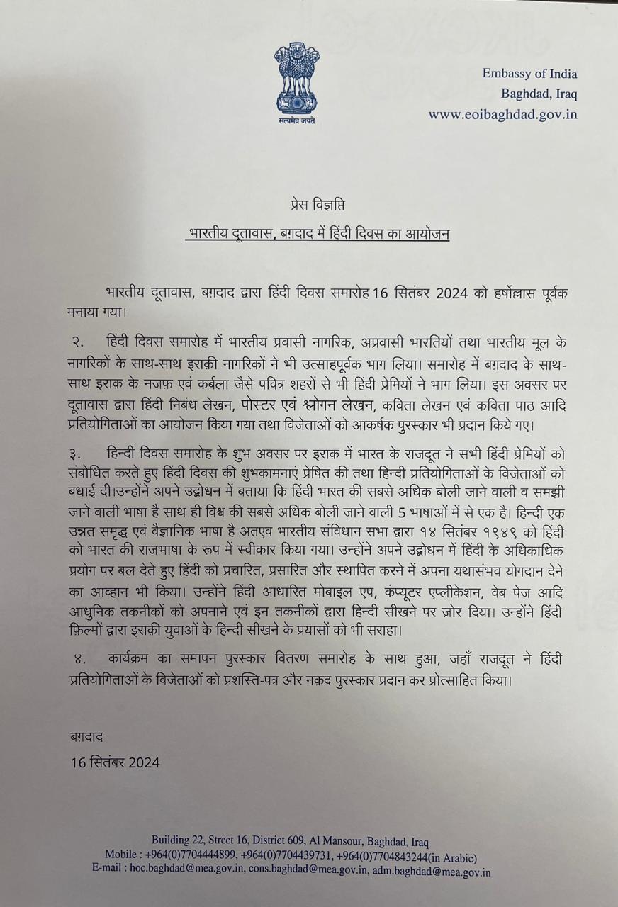 Press release: Celebration of the Hindi Day 2024 organised by Embassy of India, Baghdad on 16th September 2024.