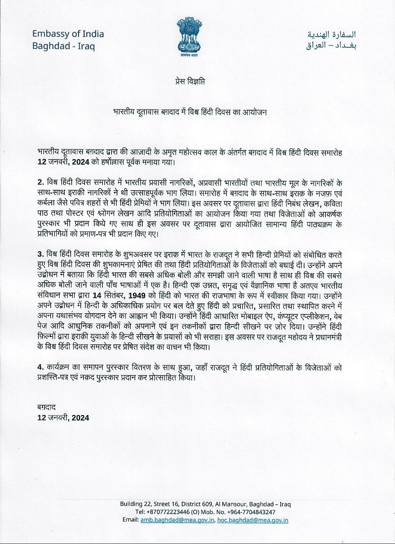 Press Release: Celebration of 'World Hindi Day' in Embassy of India, Baghdad.