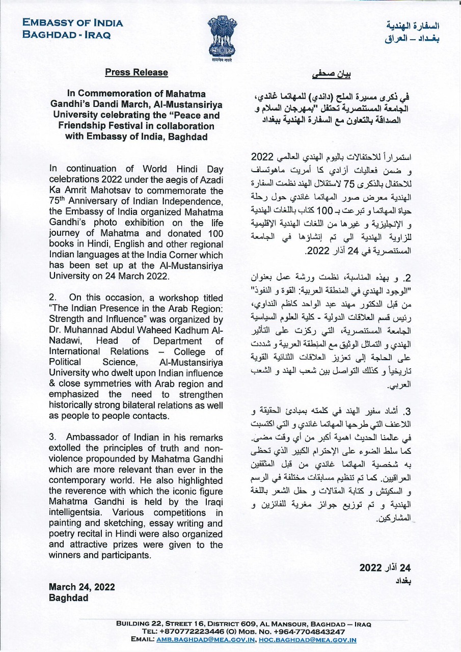 Press release for Celebration of the "Peace and Friendship Festival" organized by Embassy of India Baghdad on 24 March 2022.