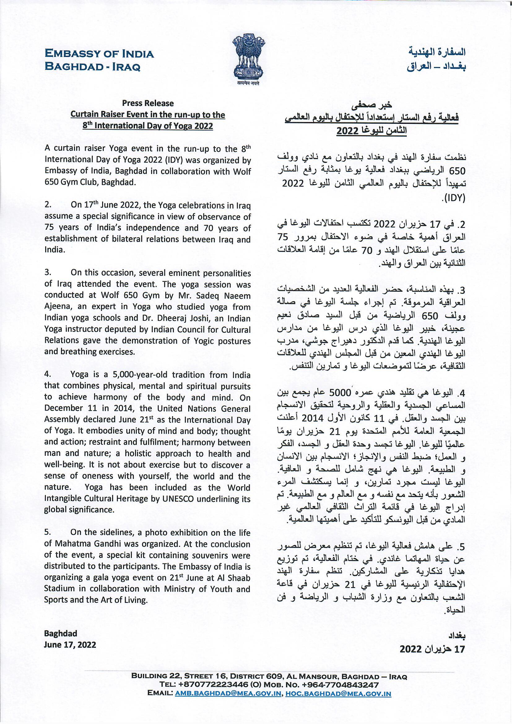 بيان صحفي عن فعالية رفع الستار التي أقيمت يوم 17 حزيران 2022 تمهيداً لليوم العالمي الثامن لليوغا