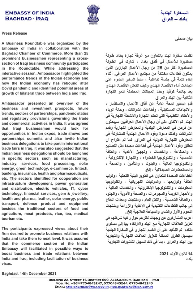 Press release for the business meet organised by Embassy of India at Baghdad on 14th December 2021