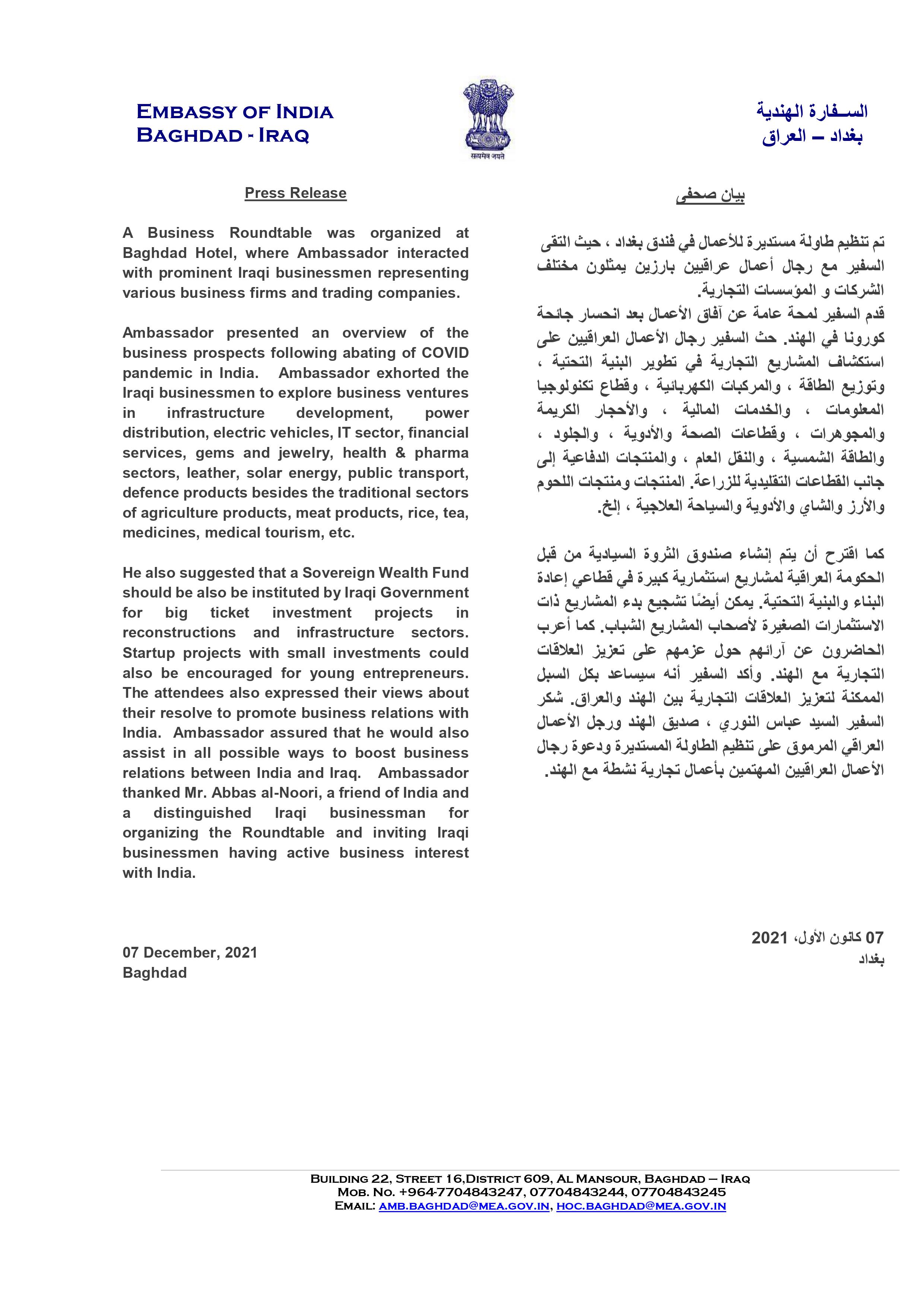 Press release for the business Roundtable at Baghdad Hotel held on 7th December 2021 by the Embassy of India, Baghdad بيان صحفي للطاولة المستديرة للأعمال في فندق بغداد المنعقدة بتاريخ 7 كانون الأول 2021 من قبل سفارة الهند ، بغداد