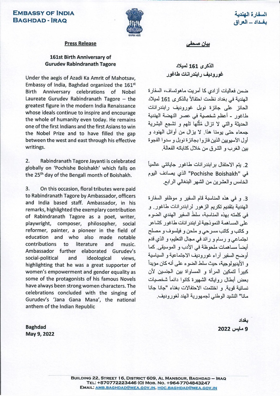 بيان صحفي بمناسبة الاحتفال بالذكرى الـ 161 لميلاد الفائز بجائزة نوبل رابندرانات طاغور في 9 مايس 2022
