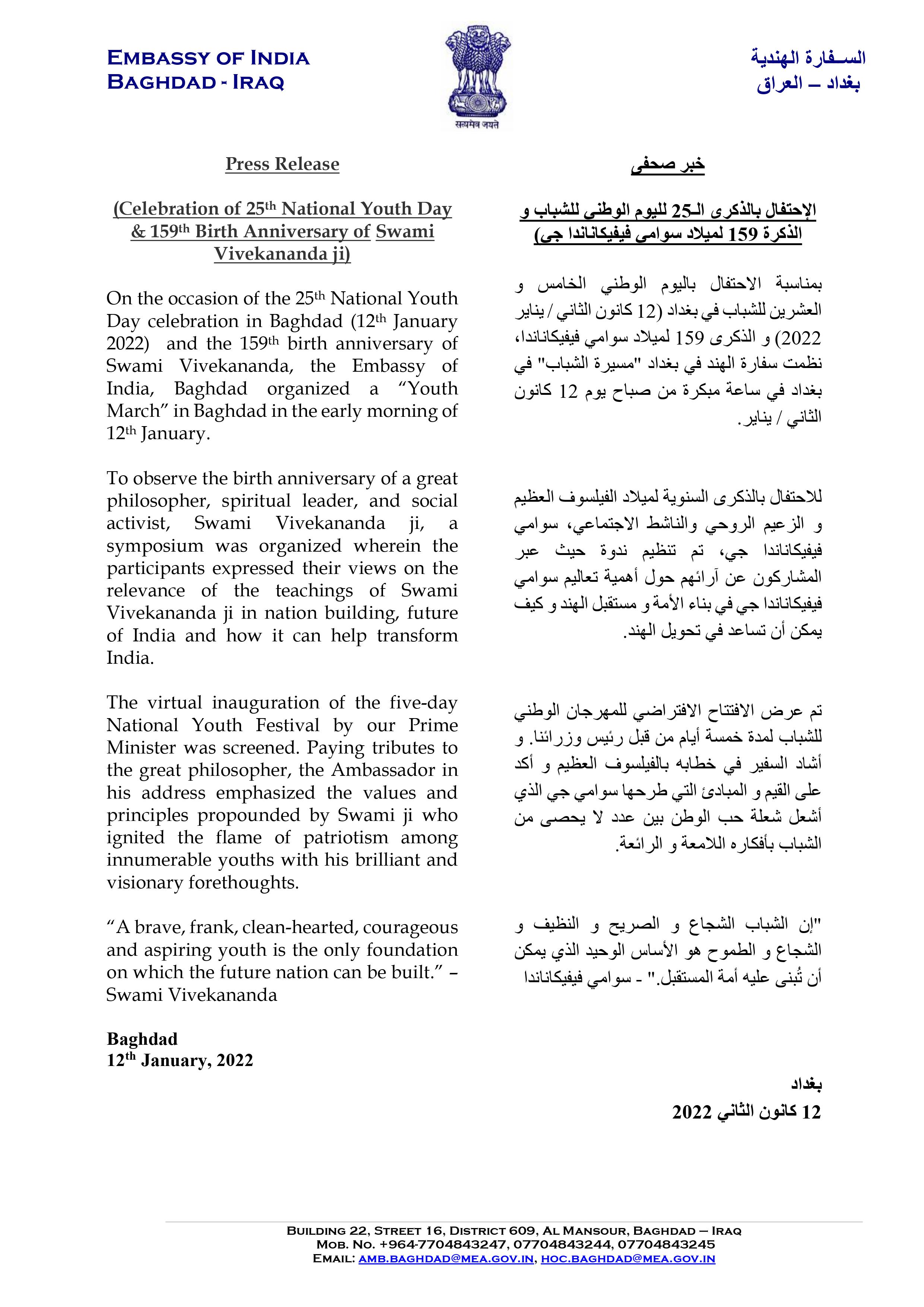 بيان صحفي بمناسبة الاحتفال باليوم الوطني الخامس والعشرين للشباب والذكرى 159 لميلاد سوامي فيفيكاناند جي في 12 يناير 2022.
