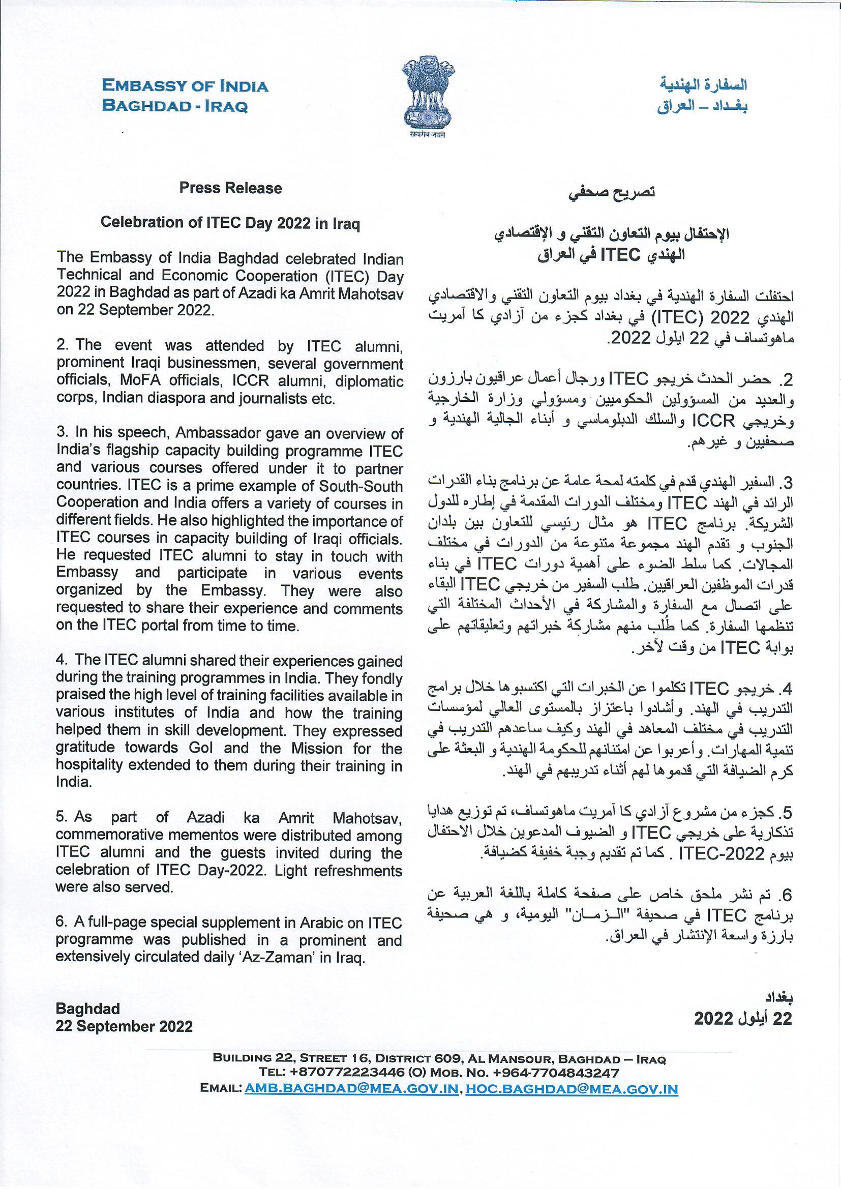 Press release for the celebration of Indian Technical and Economic Cooperation (ITEC) Day 2022 held on 22nd September 2022 by Embassy of India, Baghdad.