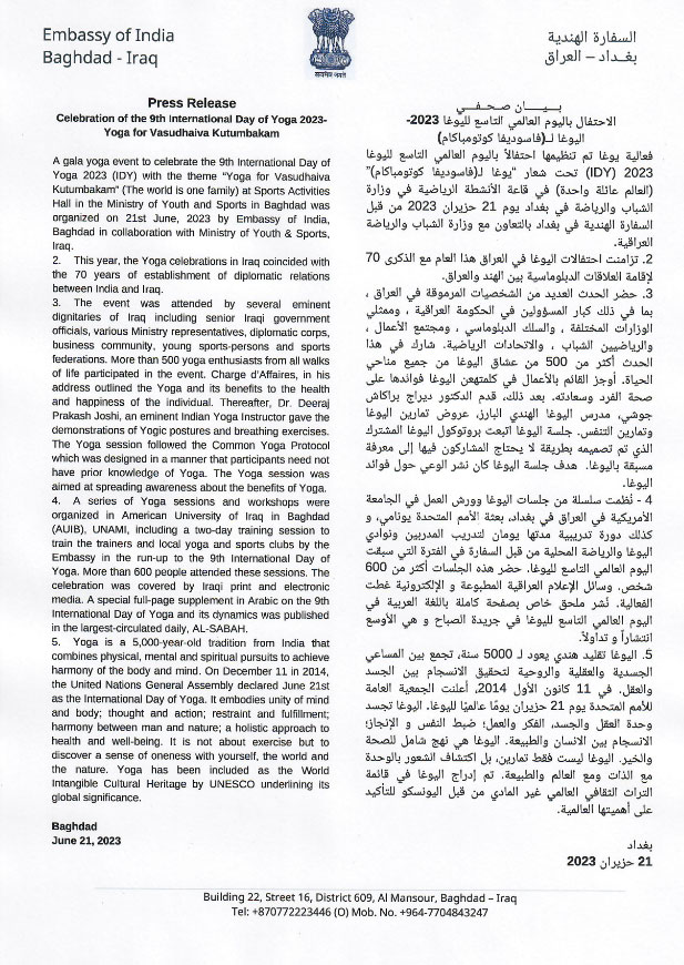 Press release for the celebrations of 9th International Day of Yoga held by Embassy of India, Baghdad on 21st June 2023. بيان صحفي بمناسبة الاحتفال باليوم العالمي التاسع لليوغا الذي أقامته سفارة الهند ببغداد في 21 يونيو 2023.