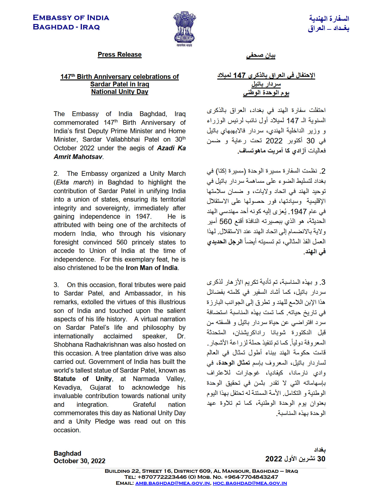 "بيان صحفي عن الاحتفال بالذكرى 147 لميلاد سردار فالابهبهاي باتيل و الذي أقامته السفارة الهندية في بغداد يوم 30 أكتوبر 2022."