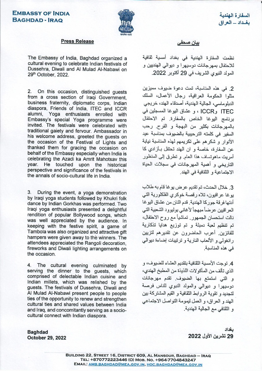Press release for the event Indian Festivals Dusshera, Diwali and Mulad al-Nabawi held by Embassy of India, Baghdad on 29 October 2022.