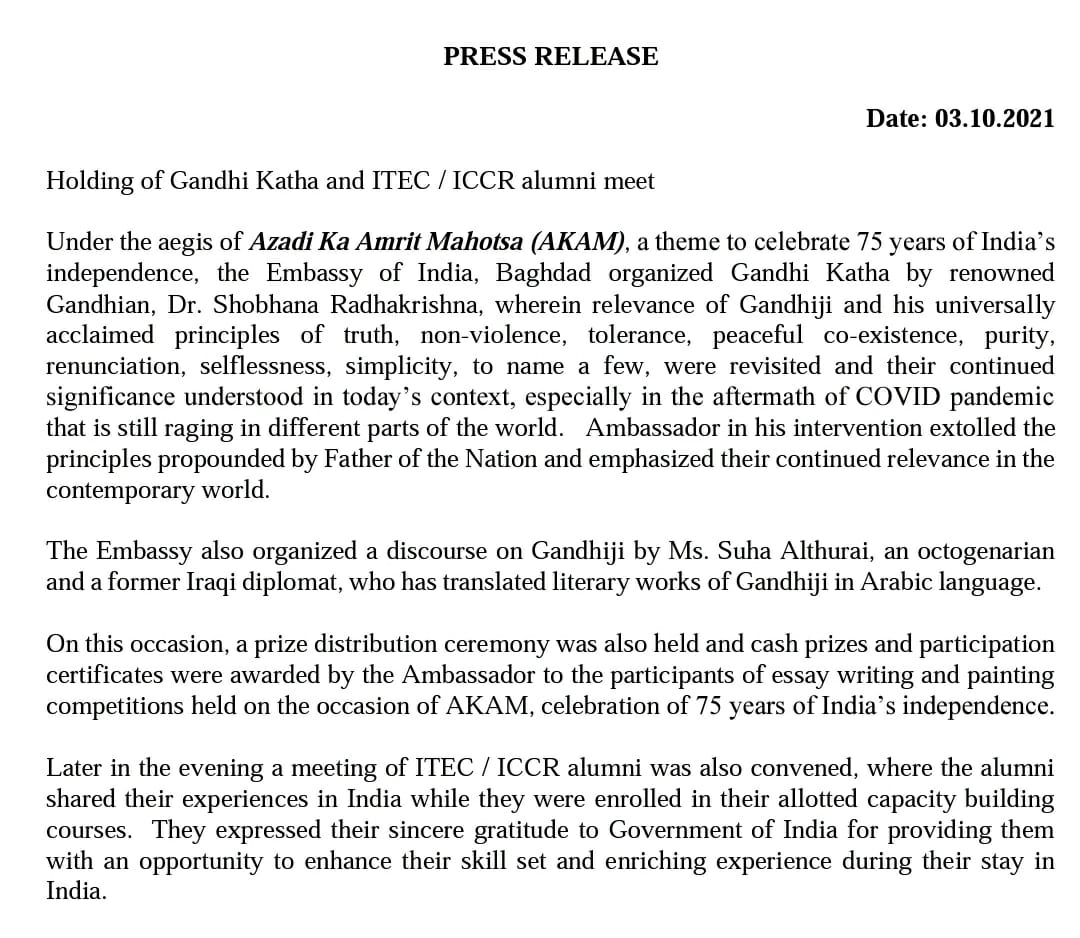 Press release for the events held on 3rd October 2021 at the Embassy of India, Baghdad to commemorate 152nd birth anniversary of Mahatma Gandhi under the aegis of #AzadiKaAmritMahotsav