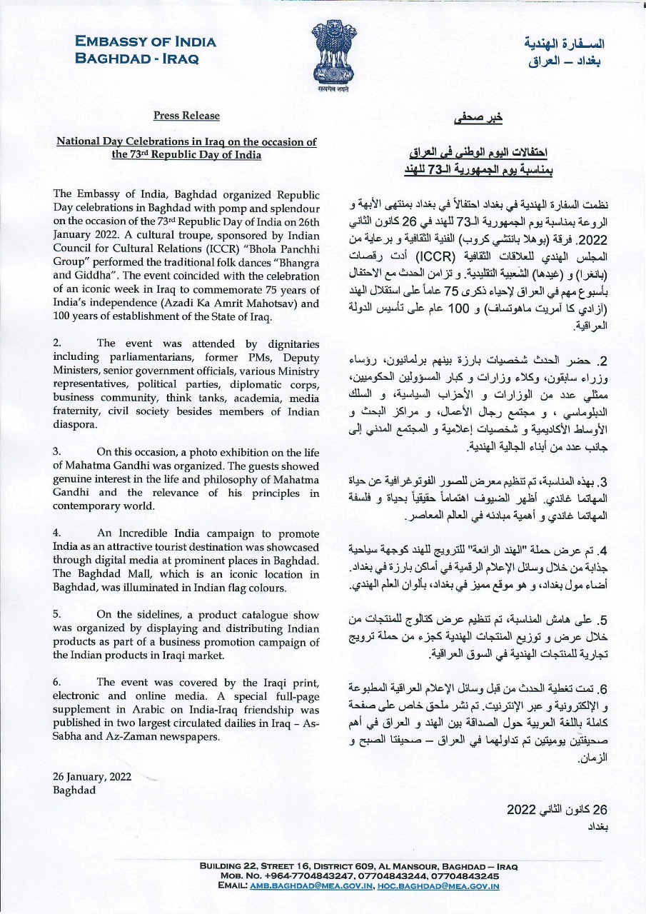 Press release for the National Day Celebrations held on 26th January 2022 in Iraq on the occasion of the 73rd Republic Day of India