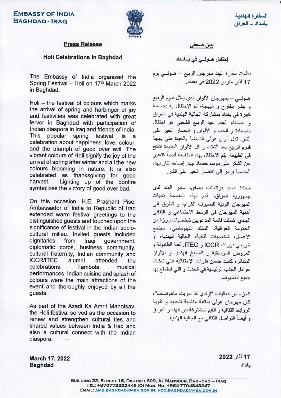 Press release for the Spring Festival - Holi organized by the Embassy of India, Baghdad on 17th March 2022