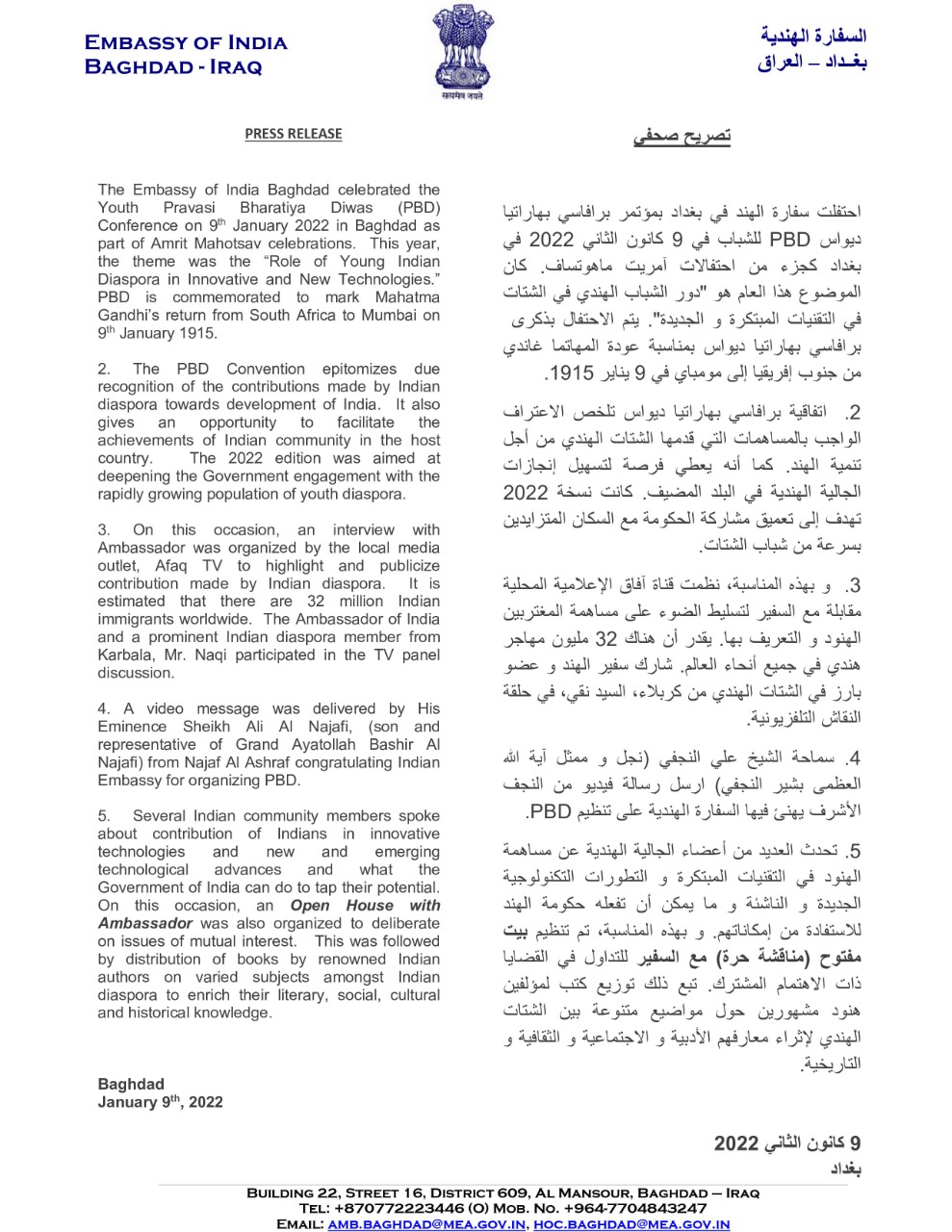 بيان صحفي عن مؤتمر الشباب برافاسي بهاراتيا (PBD) يوم 9 يناير كانون الثاني 2022 احتفلت به سفارة الهند في بغداد.