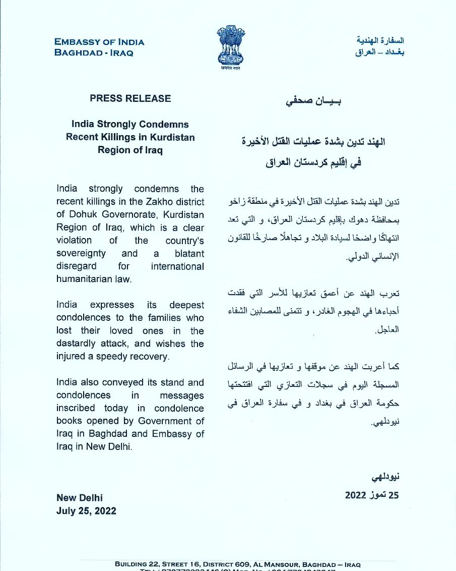 Press Release: India strongly condemns recent killings in Kurdistance Region of Iraq