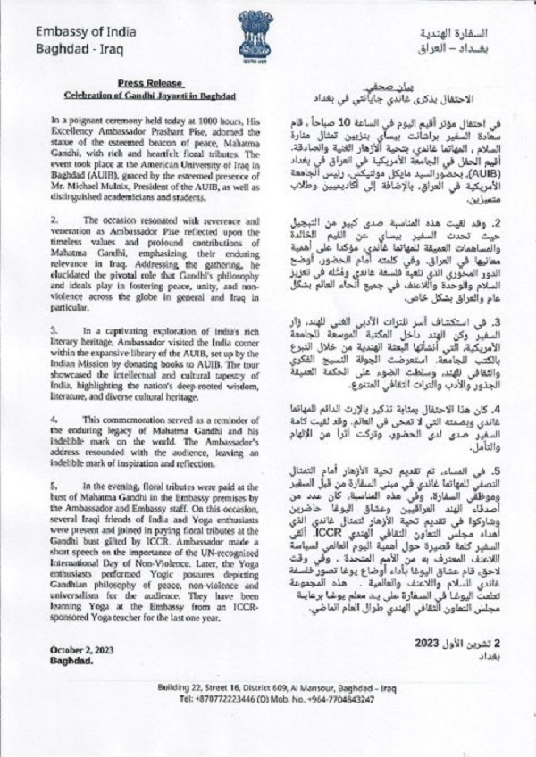 Press Release on celebration of 'Gandhi Jayanti' in Baghdad.