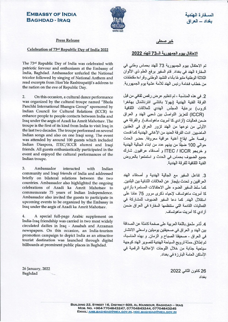 Press Release on the Celebration of 73rd Republic Day of India. بيان صحفي بمناسبة الاحتفال بيوم الجمهورية الـــ73 للهند