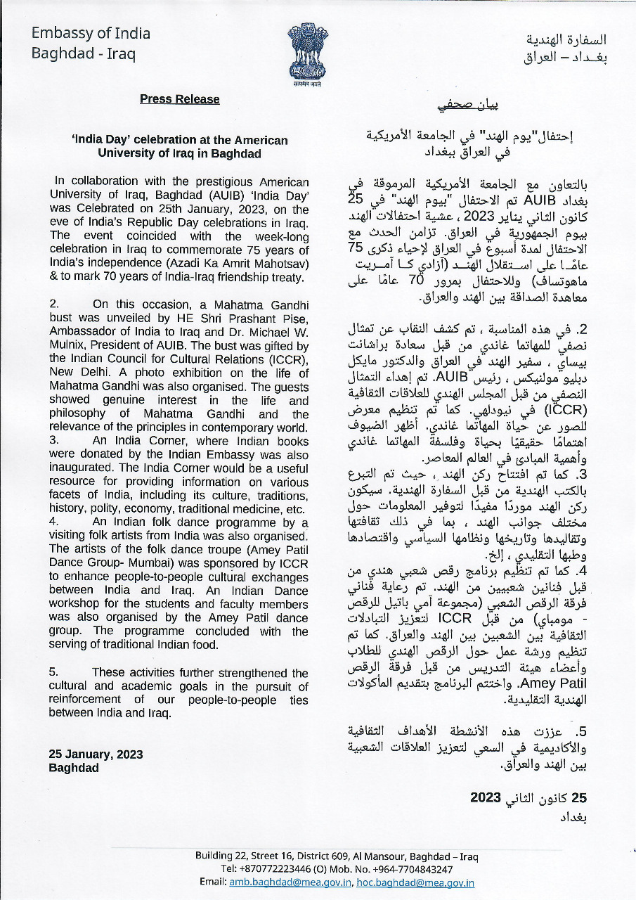 Press release on the ‘India Day’ celebration at the American University of Iraq in Baghdad on 25th January 2023.