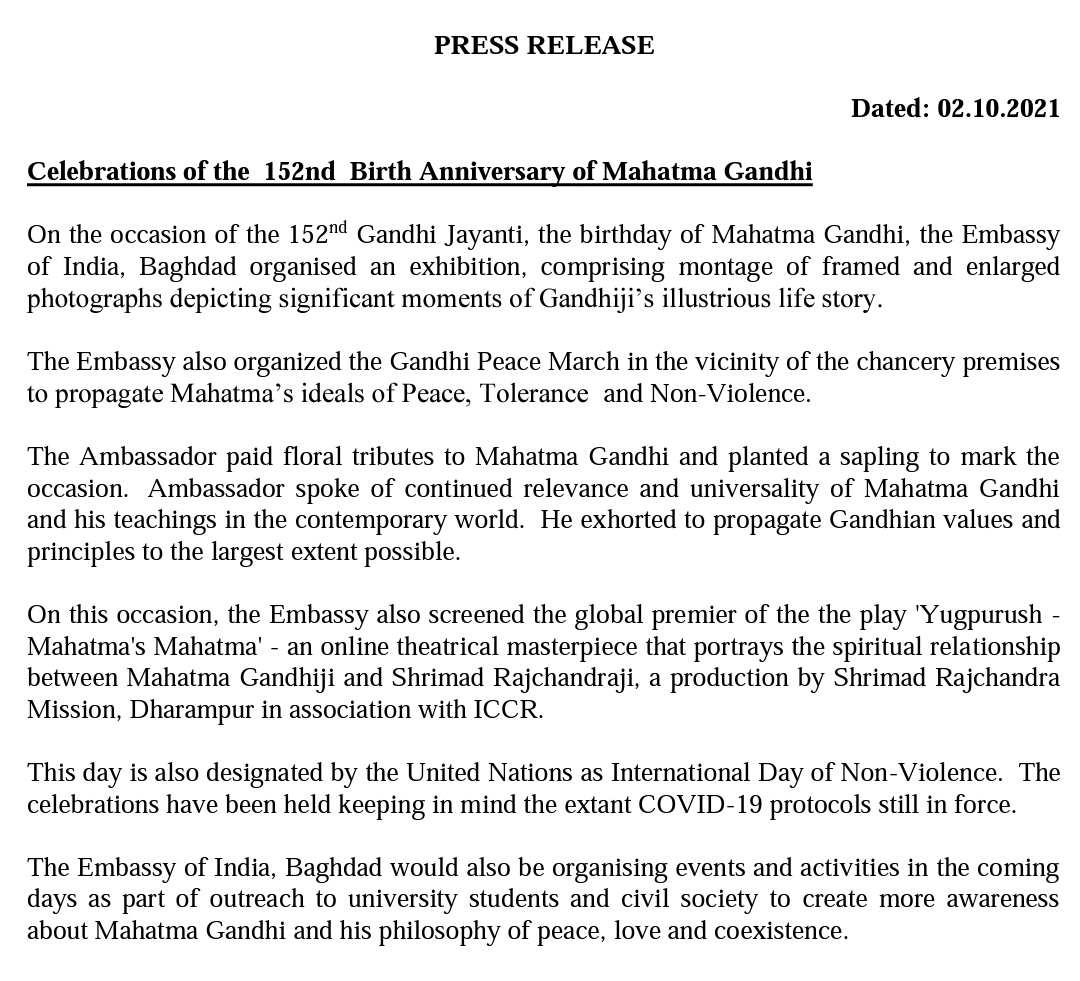 Press release on the occasion of 152nd Birth Anniversary of Mahatma Gandhi