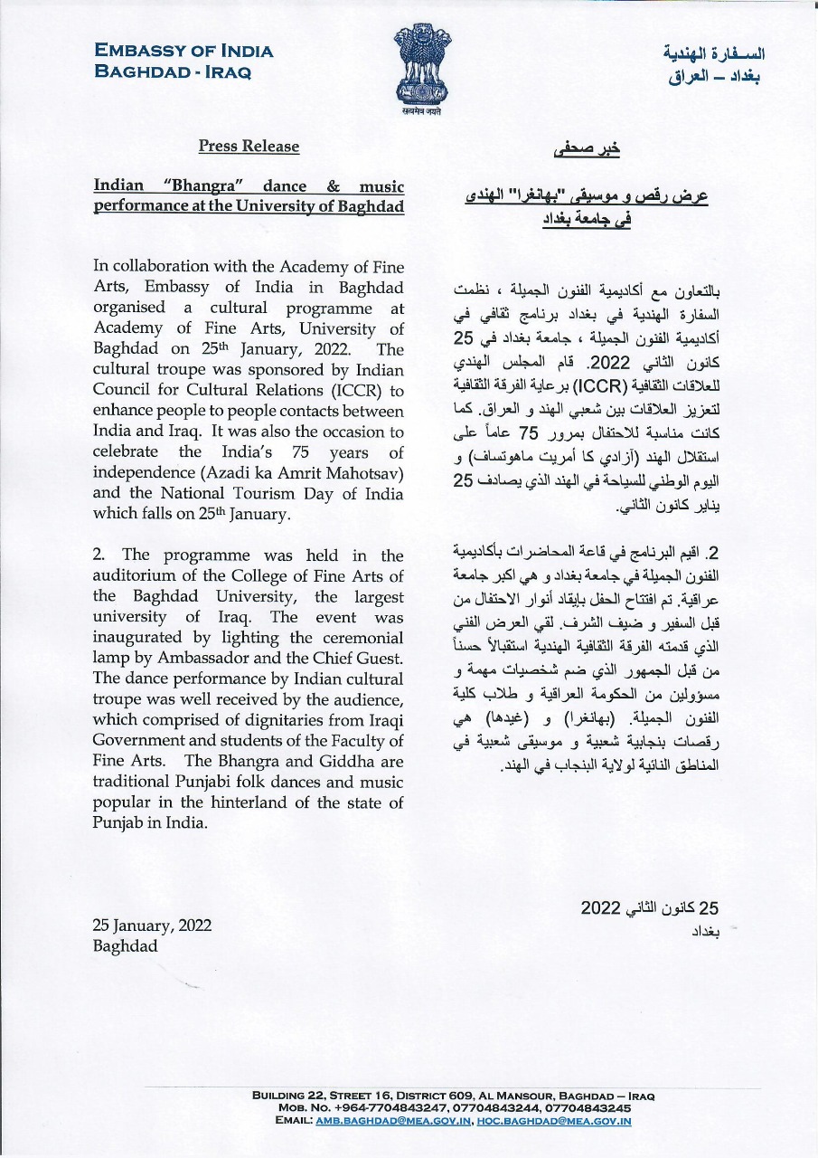 Press release on the occasion of Bhangra & Giddha dance and music performance at University of Baghdad on 25th January 2022.