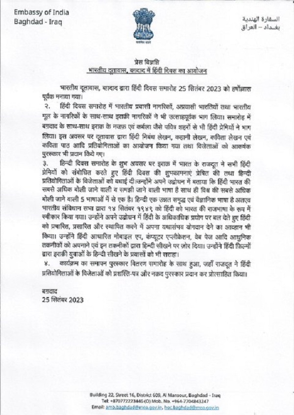 Press Release on the occasion of celebration of Hindi Day in Embassy of India, Baghdad.
