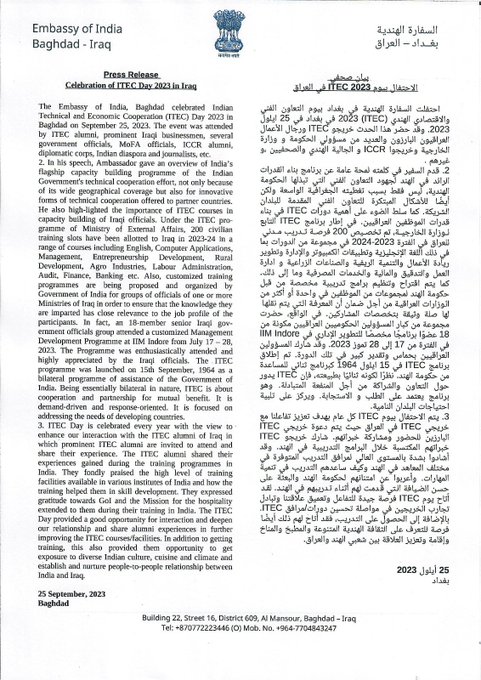 Press Release on the occasion of celebration of ITEC Day in Embassy of India, Baghdad.