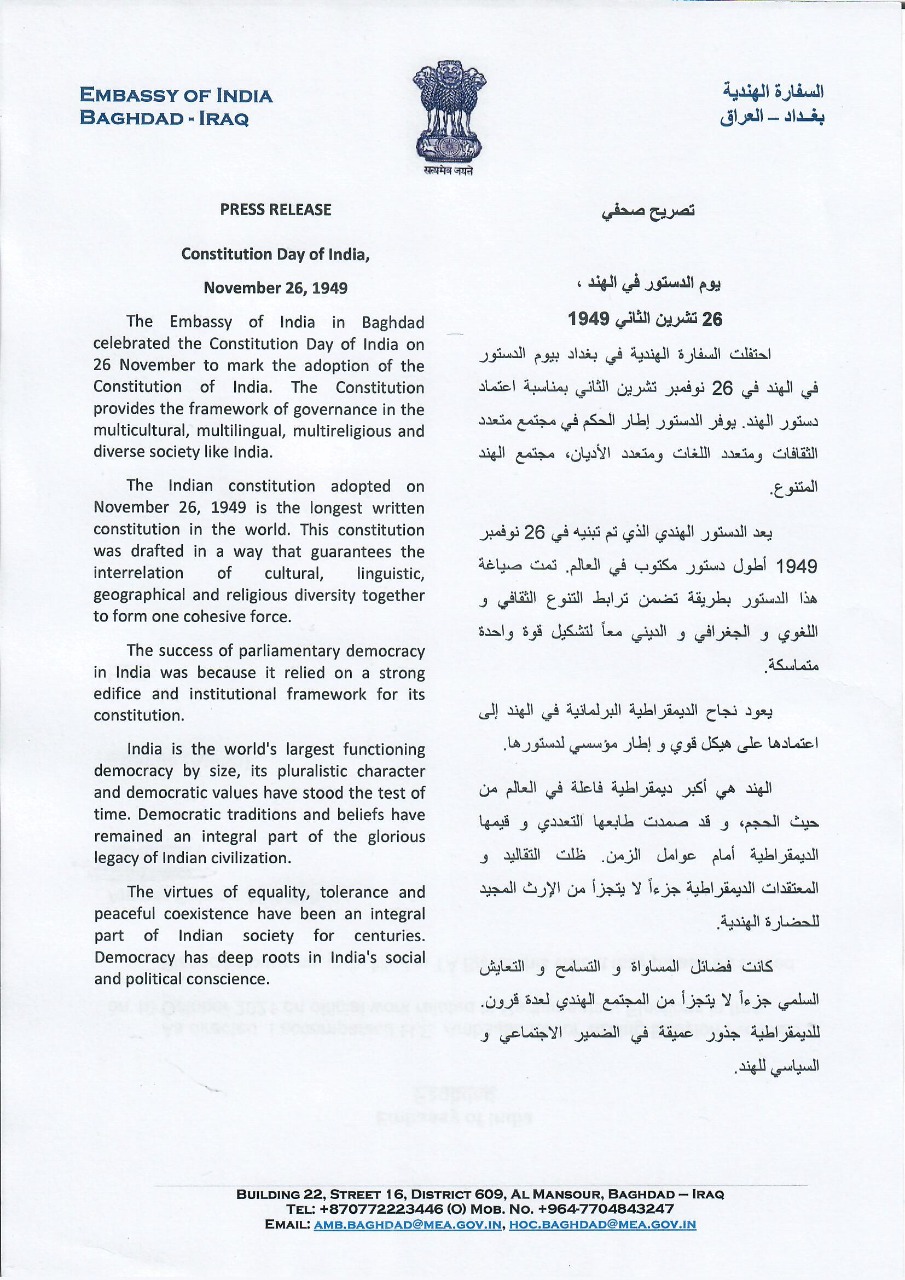 Press release on the occasion of Constitution Day of India بيان صحفي بمناسبة يوم الدستور الهندي